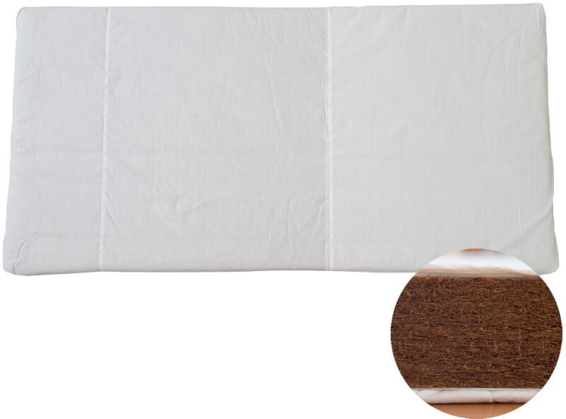 kókuszmatrac 60x120 kókuszmatrac 60x120, kiságy matrac tulajdonsága: Természetes alapanyagú préselt kókuszrostból készült gyermek ágybetét. Rugalmas szerkezetének köszönhetően kényelmes fekvést biztosít. Stabilan tartja a gerincoszlopot. Szellőzése kiváló a rostszerkezetnek köszönhetően. Alapanyaga: kókuszrost 1 cm vastag akrilréteggel bevonva Huzata: 100% pamut A ruga