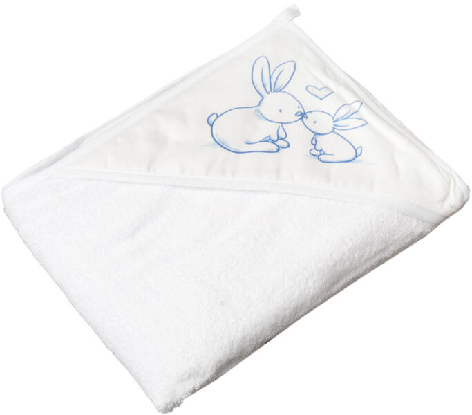 Tega kapucnis kifogó Nyuszi 100x100 Anyaga: 100% kiváló minőségű pamutból készült Jellemzők: Jó vízfelszívó képesség: Kiválóan felszívja a vizet, így gyorsan és hatékonyan szárítja a gyermeket. Védelem a hideg ellen: Melegen tartja a csecsemőt fürdés után, megóvva őt a megfázástól. Kapucni: A kapucni védelmet nyújt a baba fejének, és segít annak megszárítá