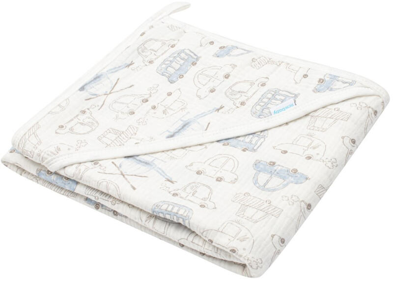 Aranyos baba muszlin törölköző New Baby My Cars. Puha, kiváló minőségű és nagyon nedvszívó anyagból készült. Ideális kisbabák és idősebb gyermekek számára. A törölköző kapucnival rendelkezik, amely megvédi a baba fejét a hidegtől. A törölköző tökéletesen felszívja a nedvességet és nagyon gyorsan szárad. 2 rétegű anyagból készült. Anyaga: 100% pamut. Mére