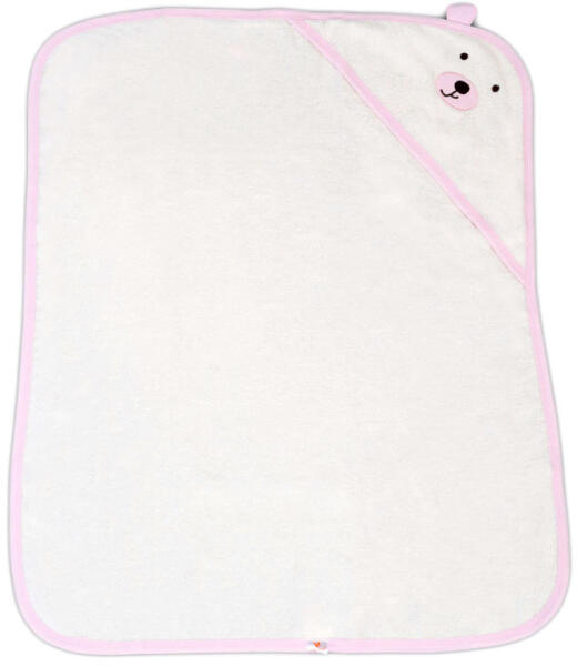 BALOO kapucnis törölköző/kifogó/kapucnis fürdetőlepedő macis, 100% pamut frottír anyagból készült. Alapszíne fehér, szegélycsík színe Rózsaszín.