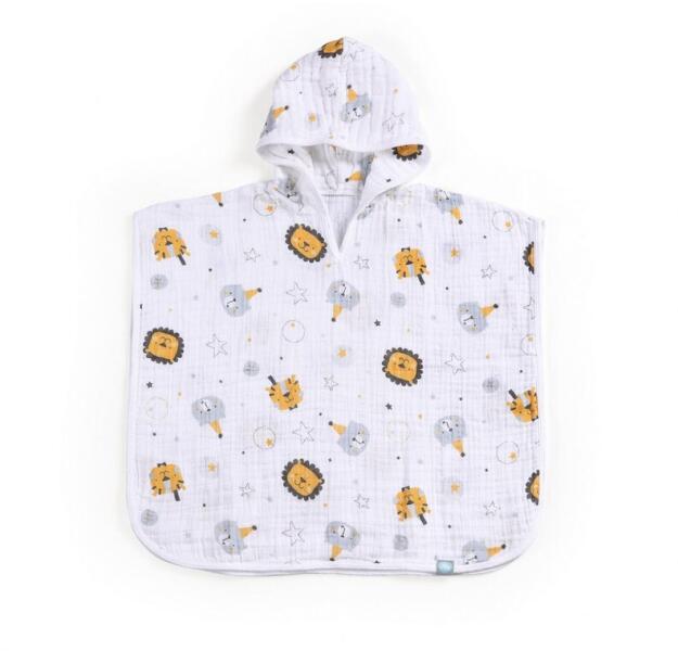 100% pamut muszlin Puha, könnyű és finom Biztonságos a gyermekek bőrére Nem okoz irritációt Tökéletesen elvezeti a vizet A légáteresztő anyag hőérzetet biztosít a gyermek számára Kapucni hímzett állattal Univerzális méret Nem igényel vasalást A termék méretei: 80 x 80 cm Anyaga: pamut muszlin Moshatóság: Mosógépben mosható max. 30 fokon szárítógépben nem szárít