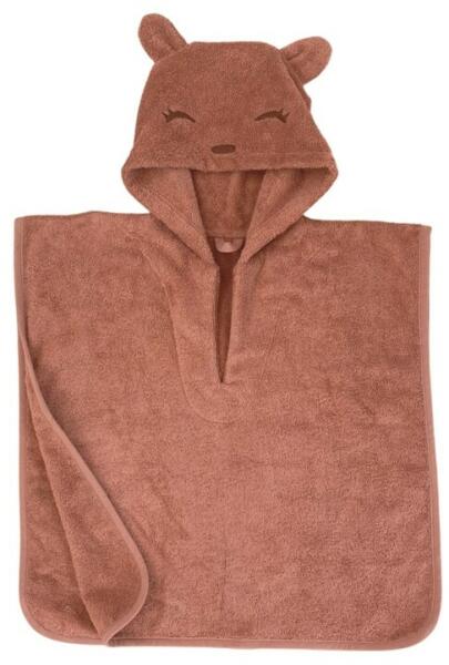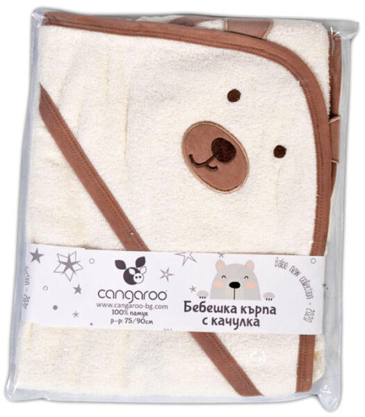 BALOO kapucnis törölköző macis EKRÜ, 100% pamut frottier anyagból készült kényelmes kifogó, 70x90cm fürdőlepedő. Alapszíne fehér, szegélycsík színnel EKRÜ szegéllyel