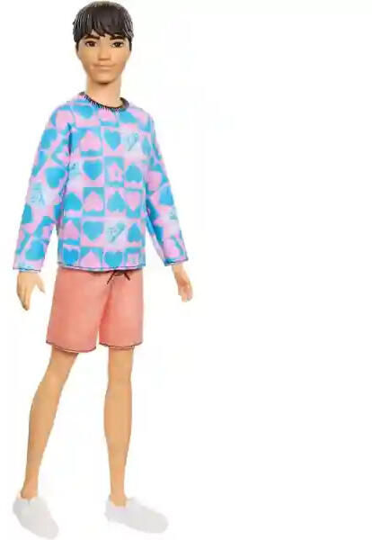 Ez a Barbie Ken baba vidám, trendi megjelenésével hódít: színes, mintás pulcsit visel, amelyet divatos szívecskék és virágminták díszítenek, valamint barack színű rövidnadrágot. Karcsú testalkatával és vagány, fekete hajával igazán stílusos megjelenést kölcsönöz. A fehér hajócipők tökéletesen kiegészítik az egyedülálló, kalandos stílust. A Barbie babák vég