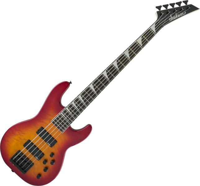 Jackson JS Series Concert Bass JS3VQ 5-húros elektromos basszusgitár, Cherry Burst színben Széria: JS Test: Nyárfa test, juhar fedlap Nyak: Juhar Menzúra: 35" (889 mm) Rádiusz: 12"-16" (304.8 mm - 406.4 mm) Fogólap: Amaranth Bund: 24, Jumbo Hangszedő: Jackson® Covered High-Output Humbucking (híd), Jackson® Covered High-Output Humbucking (nyak) hangszedők Elektronika: 2 hangerő, 3-sá