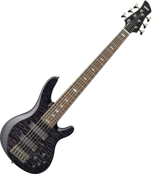 Yamaha TRB1006J 6-húros elektromos basszusgitár, Translucent Black színben Test: Juhar/éger, kagylós juhar Nyak: 5-részből illesztett juhar/mahagóni Menzúra: 35" (889.0mm) Rádiusz: 40" (1000 mm) Fogólap: Rózsafa Bund: 24, Medium Hangszedő: Humcanceled Single Coil / Alnico V (híd), Humcanceled Single Coil / Alnico V (nyak) hangszedők Elektronika: Hangerő, balance, 3-sávos EQ (Bass,