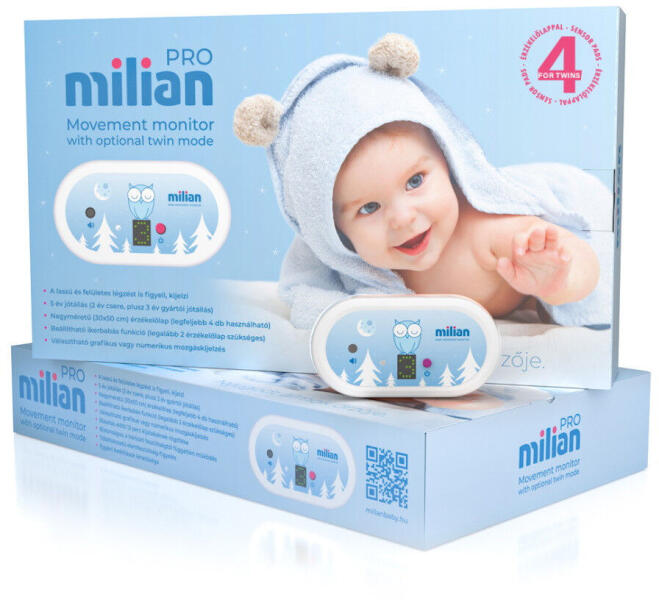 MILIAN PRO Twins ikres új generációs légzésfigyelő és alvásmonitor 4 érzékelőlappal. Modern, letisztult megjelenés. Korszerű, magas színvonalú magyar termék. Mozgás és alvásmonitor. Hagyományos számkijelzés is használható, de beállíthatunk folyamatos grafikus kijelzést is (alvásmonitor). Ezáltal betekintést nyerhetünk a baba pillanatnyi alvásállapotába, nyugodtan