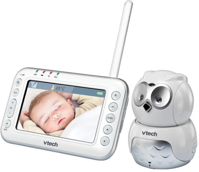 Gyermek digitális bébiőr Vtech BM4600. Lehetővé teszi a megbízható zavarásmentes működést kültéren akár 300 méterre, beltéren 50 méterre - WGPGA 480x270 pixels, - 2,4GHz technológia, Wi-Fi barát frekvencia - Éjszakai fény a babaegységen - LED-ek reagálnak hangokra - 5 altatódal és 4 természet hangjai lejátszó - Állítható kameraszög - szög: 56 fok - függőleges sz