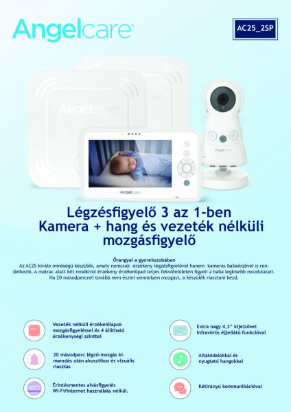 Gyártó: Angelcare Modell: AC127 Leírás: Légzésfigyelő és kétirányú babaőrző Vezeték nélküli egy érzékelőlap Megnövelt érzékenység: légző mozgás figyelés a matrac teljes felületén új sensaure technológiával Érzékelőlap érzékenységének szabályozása 15 másodperc légző-mozgás kimaradás után előriasztás; 20 másodperc után akusztikus és vizuális riasz