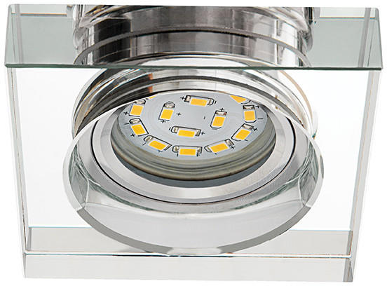 Üveg fix mennyezeti spot lámpa fém gyűrűvel. A lámpa működtetéséhez 12V-os trafó szükséges, ami nem tartozék. A lámpa foglalata viszont cserélhető GU10-es foglalatra, amivel már nincs szükség külön működtetőre.