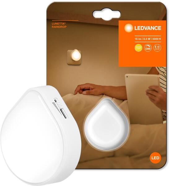 Ledvance Lunetta Raindrop LED éjszakai lámpa, szabályozható, 0,5W, 15 lm, meleg fény (3000K), 220-240V, fehér Alkalmazási területek - Gyermek hálószobák - Folyosók, lépcsők - Csak beltéri használatra A termék előnyei - Jellegzetes és elegáns kialakítás - Plug and Play az EU kártyának köszönhetően A termék jellemzői - Választható fényerősség - Tápfeszültség: 220