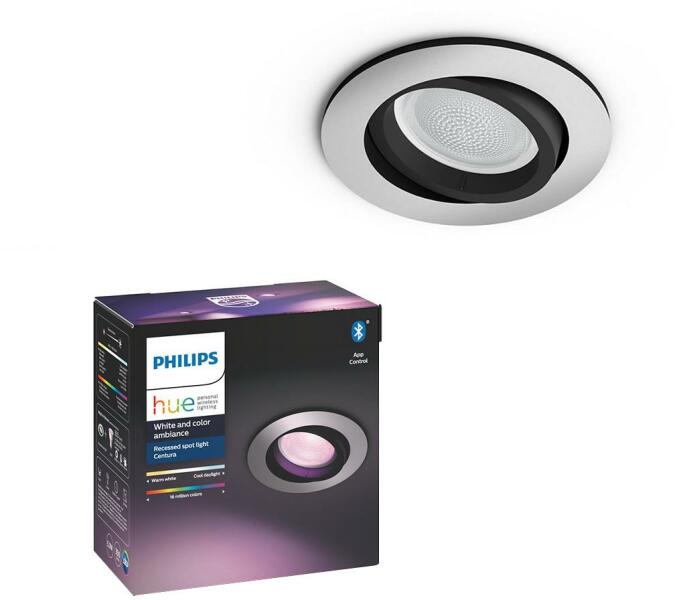 Philips Hue Centura süllyesztett szpotlámpa aluminium Okosvilágítás egyszerűen a Philips Hue Centura süllyesztett szpotlámpával: GU10 LED-fényforrást tartalmaz Bluetooth-vezérlés alkalmazáson keresztül Irányítsa alkalmazással vagy a hangjával* További lehetőségekért Hue Bridge eszközzel bővíthető Szabályozzon akár 10 lámpát a Bluetooth alkalmazással A Hue Bluetooth