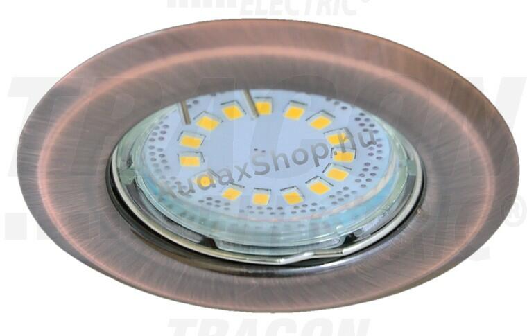 Préselt acéllemezből készült fix spotlámpa, fényforrás nélkül. A kör alakú, süllyesztett lámpatest helyi és dekorációsvilágításhoz is felhasználható. Antik stílusú lakások, otthonok kiegészítője is lehet a matt réz színű spotlámpafoglalat, amelynek bronz sárga színe jól harmonizál a régies, rusztikus lámpákkal, bútorokkal, sárgaréz lakberendezésitárgyakk