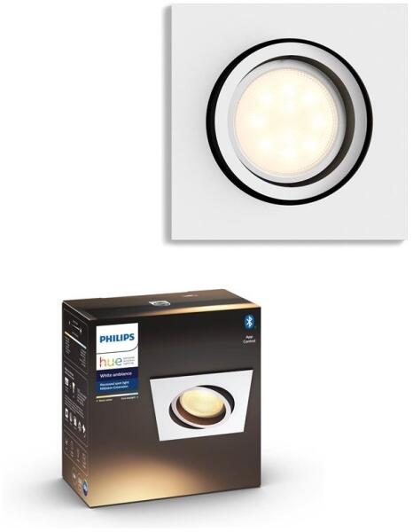Philips Hue Milliskin süllyesztett szpotlámpa négyzet fehér Okosvilágítás egyszerűen GU10 LED-fényforrást tartalmaz Bluetooth-vezérlés alkalmazáson keresztül Irányítsa alkalmazással vagy a hangjával* További lehetőségekért Hue Bridge eszközzel bővíthető Párosítsa egy vezeték nélküli fényerő-szabályozós kapcsolóval az egyszerű vezeték nélküli vezérléshez Ve