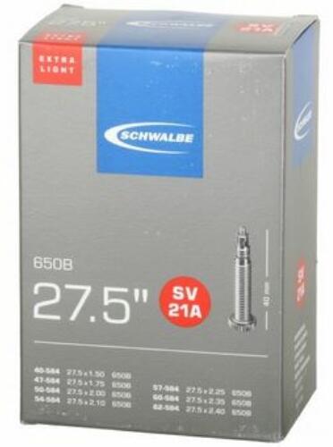Schwalbe SV21A Extra Light 27,5 x 1,5-2,4 (40/62-584) MTB belső gumi 40 mm hosszú bontható szeleppel, 135 g, presta 27,5-ös (650B), montikhoz extra széleskörűen felhasználható belső. A Butyl alapanyagnak köszönhetően igen nagy a nyúlékonysága, tehát széles mérettartományban használható, csakúgy, mint a többi remek minőségű Schwalbe belső. Nem ismered ez a márkát? Vidd