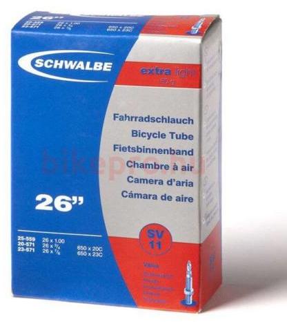 Schwalbe SV11 Extra Light 26 x 1,0 (20/25-559/571) MTB belső gumi 40 mm hosszú bontható szeleppel, 65 g, presta Kifejezetten kis szélességű városi 26-os külsőkbe szánt extra könnyű belső. A Butyl alapanyagnak köszönhetően igen nagy a nyúlékonysága, tehát széles mérettartományban használható, csakúgy, mint a többi remek minőségű Schwalbe belső. Nem ismered ez a márk