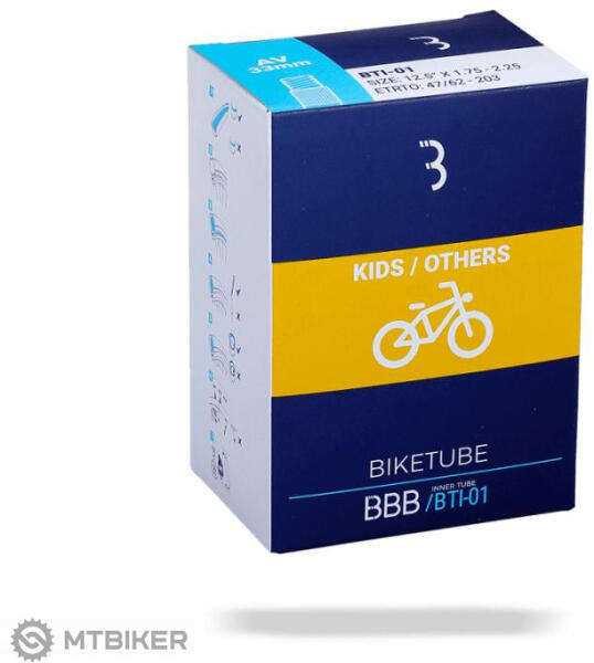 Belső tömlő gyermekkerékpárhoz 12 1/2" kerékmérettel. Kiváló minőségű butilgumiból készült, különböző típusú szelepekkel. FV- golyóscsap 33 mm AV - automatikus szelep 33 mm DV – Dunlop összecsukható (BV verzió hajlított szelep)