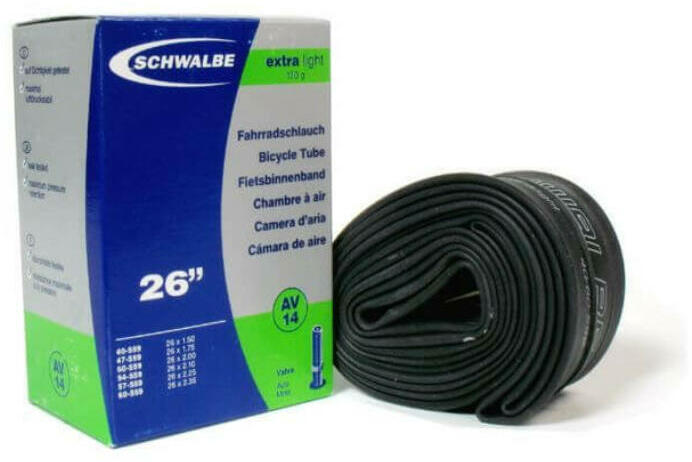 Schwalbe AV14 Extra Light 26 x 1,5-2,35 (40/60-559) MTB belső gumi 40 mm hosszú szeleppel, 134 g, autós Nagy mérettartományban használható, mégis kedvező tömegű 26-os monti belső. A Butyl alapanyagnak köszönhetően igen nagy a nyúlékonysága, tehát széles mérettartományban használható, csakúgy, mint a többi remek minőségű Schwalbe belső. Nem ismered ez a márkát? Vidd
