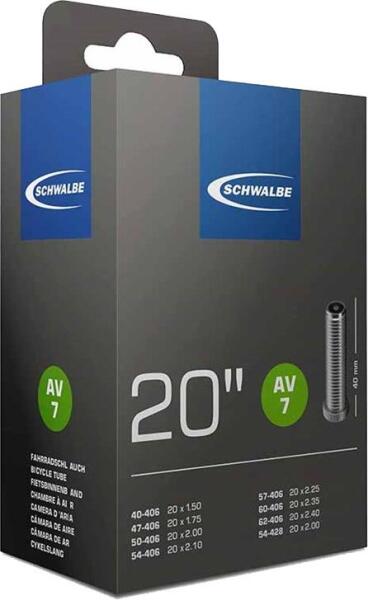Belső gumi kerékpárokhoz. 20-as kerékméretre. Méret: 20*1.5/20*2.5 (406-40/ 406-62). AV7 Auto szelepes. Súlya: 145 g. Schwalbe levegőállóság. Minden egyes belsőt beraknak egy öntő formába és úgy vulkanizálják össze. Az egész folyamat alatt gondosan figyelnek arra, hogy állandó maradjon a falvastagság. A SCHWALBE belsőkben a nyomás hosszabb ideig megmarad. 30 nap eltelte u