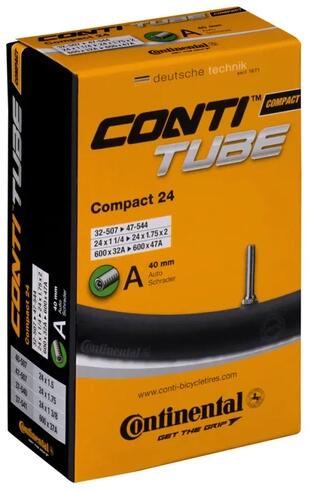 Continental Compact24 24x1,25-1,75 (32/47-507/544) DO belső gumi, AV40 (40 mm hosszú szeleppel, autós) Jó minőségű, dobozos belső gumi 24-es kerékpárokhoz. Anyaga: butyl Belső átmérő (inch) 24 Szélesség, 32 - 47mm külsőkhöz Szeleptípus AV autós Szelephossz 40mm Gyártó Continental Méretek milliméterben 32-47-507 Technológia hagyományos Csomagolás dobozos Tömlő tömege,
