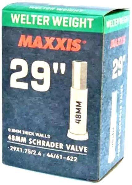 Maxxis belső gumi 29" kerékméretű MTB kerékpárokhoz 29x1.75/2.4 méretben, 48 mm hosszú autó (AV) szeleppel, 0,8 mm falvastagsággal.