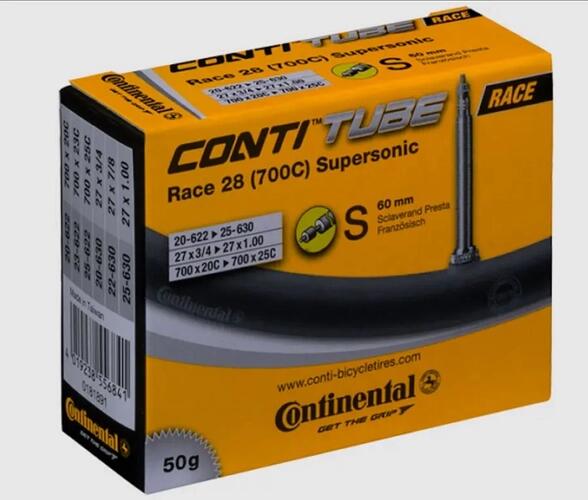 Continental Race28 Supersonic 622 x 20/25 (700c) DO országúti belső gumi, FV60 (60 mm hosszú szeleppel, presta), 50gUltrakönnyű belső gumi országúti kerékpárokhoz, hosszított presta szeleppel, aero felnihez. Használható 28 colos, 622-es átmérőjű oszágúti kerekekhez, 20-25mm széles gumikhoz. Használható ezen kívül "régi országúti 27 colos" 630-as kerékátmérőhöz is.