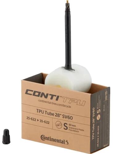 Continental ContiTPU 28, (25/35-622) belső gumi, TPU, FV60 (60 mm hosszú presta szeleppel), 35g, fehérSpeciális, extra könnyű és erős TPU (hőre lágyuló polyuretán) anyagú belsőországúti kerékpárokhoz. Kerekenként akár 50-100g súly is megspórolható a hagyományos belső gumikkal szemben, és az a forgó tömeg csökkenése miatt igen jelentős megtakarítás. Nagyon kis mére