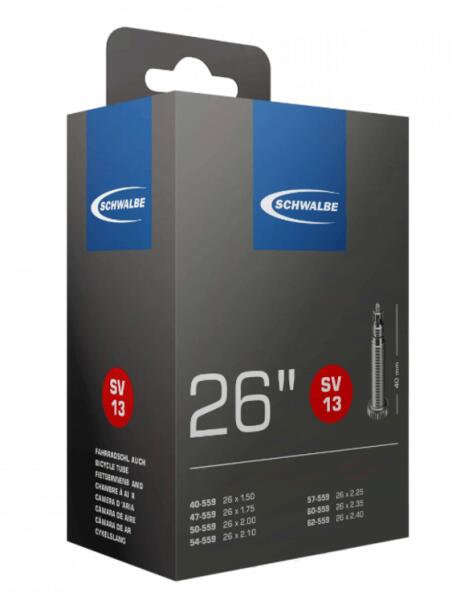 Belső gumi 26x1.5-2.4 40mm Schwalbe SV13A kerékpáros belső többnyire butilkumiból készül. A butil nagyon rugalmas és légmentesen záródó szintetikus gumi. A gumikeverékhez hasonlóan a gumiabroncsokhoz hasonlóan további adalékokra van szükség. A belső minősége nagymértékben változhat a gumi összetételétől függően. Például a Schwalbe belsők rendkívül magas légsta