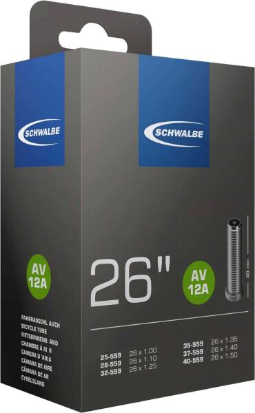 Belső gumi kerékpárokhoz. 26*1.0 - 1.5 (559-25/40). Av12A Auto szelepes. Súlya: 120 g. Schwalbe levegőállóság. Minden egyes belsőt beraknak egy öntő formába és úgy vulkanizálják össze. Az egész folyamat alatt gondosan figyelnek arra, hogy állandó maradjon a falvastagság. A SCHWALBE belsőkben a nyomás hosszabb ideig megmarad. 30 nap eltelte után a többi (No Name) gumi köze