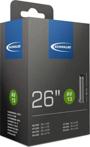 Belső gumi kerékpárokhoz. 26-os kerékméretre. Méret: 26*1.5-2.5 (559-40). AV13 Auto szelepes. Súlya: 190 g Schwalbe levegőállóság. Minden egyes belsőt beraknak egy öntő formába és úgy vulkanizálják össze. Az egész folyamat alatt gondosan figyelnek arra, hogy állandó maradjon a falvastagság. A SCHWALBE belsőkben a nyomás hosszabb ideig megmarad. 30 nap eltelte után a töb
