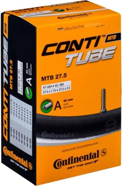 Kerékpár belső gumi 27.5-es mountain bike-hoz. Méret: 27.5x1.75/2.4 (584-47/62). Auto A40 szelep. A Continental univerzális tömlői egész köpenycsoportokat fednek le méretben, ezért is nevezik őket univerzális tömlőknek. Szelep hosszúsága: 40 mm.