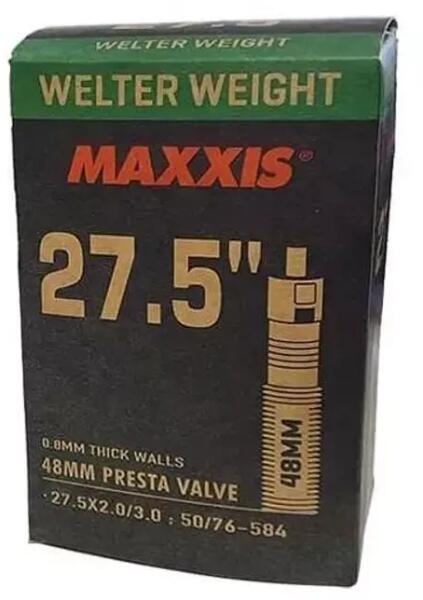 Maxxis belső gumi 27.5" kerékméretű MTB kerékpárokhoz 27.5x2.0/3.0 méretben, 48 mm hosszú presta (FV) szeleppel. 0,8 mm falvastagság, kivehető szelepmag.