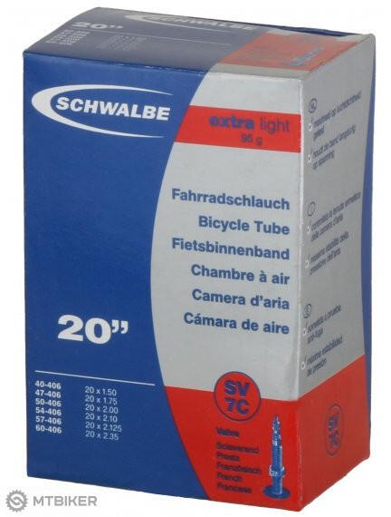 Belső cső 20"-os kerekekhez , méret 20 x 1,50-2,35", tömeg 95 g, szelep 40 mm / autó szelep. Schwalbe Extra Light cső 20 x 1,50–2,35" méretű JELLEMZŐK: - Súly 95 g. - Elágazó szelep 40 mm / autó szelep - Mérete hüvelykben : 20 x 1,50-2,35" - ETRTO : 40–60/406 - Szelep hossza : 40 mm - Súly : 95 g