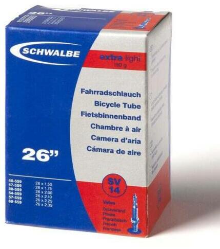 Schwalbe SV14 Extra Light 26 x 1,5-2,35 (40/60-559) MTB belső gumi 40 mm hosszú bontható szeleppel, 130 g, presta Nagy mérettartományban használható, mégis kedvező tömegű 26-os monti belső. A Butyl alapanyagnak köszönhetően igen nagy a nyúlékonysága, tehát széles mérettartományban használható, csakúgy, mint a többi remek minőségű Schwalbe belső. Nem ismered ez a márk
