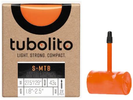 Tubolito S-Tubo MTB 27,5/29 x 1,8-2,5 (47/62-584/622) ultrakönnyű MTB belső gumi, FV42 (42 mm hosszú presta szeleppel), 43g, narancssárgaHasználható 27,5 és 29 colos kerekekhez is. Speciális, ultrakönnyű S-Tubo technológiát alkalmazó összetétel. Kerekenként akár 140g súly is megspórolható a hagyományos belső gumikkal szemben, és az a forgó tömeg csökkenése miatt igen je