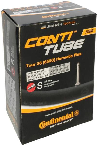 Kerékpár belső gumi. Méret: 26x1.4-2.0 (559-37/50). Presta S42 szelep. A Continental legújabb, különösen erős, hermetikusan záró tömlője a Hermetic Plus, amely sokkal hosszabb ideig képes megőrizni a megfelelő nyomást, mint a hagyományos tömlők.