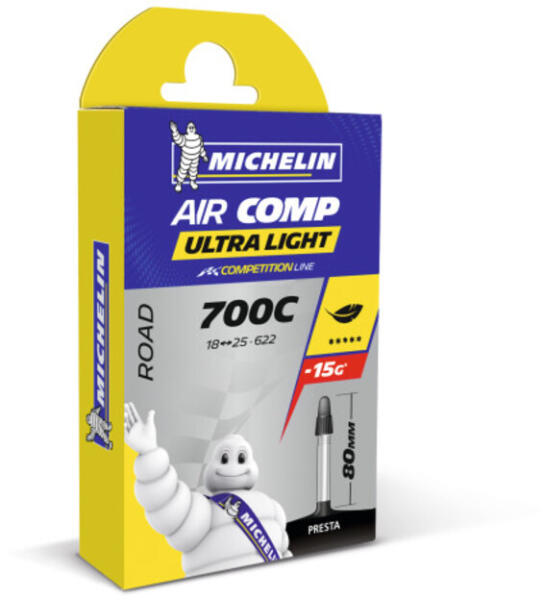 A könnyű súlyú butilcső A minimális súly 25%-kal könnyebb, mint ugyanakkora méretű MICHELIN Airstop csövek esetén Okos szelep Fekete Presta szelep, kompatibilis szelephosszabbítókkal Első/Hátsó 81g