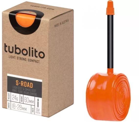 Tubolito S-Tubo Road 622 x 18-28 (700 x 18-28C) országúti TPU belső gumi, ultrakönnyű, FV60 (60 mm hosszú fekete presta szeleppel), 24g, narancssárga gumiSpeciális, extra könnyű és erős TPU anyagú belső. Általános országúti használatra, kis súlyánál és méreténél fogva pótguminak is ideális. A mindössze 24 grammos S-Tubo Road a világ legkönnyebb országúti belső gum
