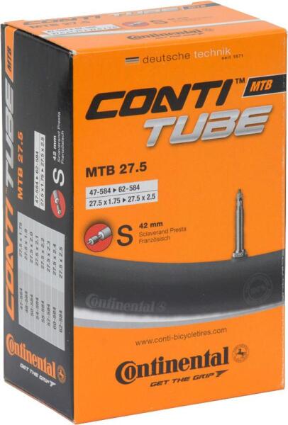 Kerékpár belső gumi 27.5-es mountain bike-hoz. Méret: 27.5x1.75/2.4 (584-47/62). Presta S42 szelep. A Continental univerzális tömlői egész köpenycsoportokat fednek le méretben, ezért is nevezik őket univerzális tömlőknek. Szelep hosszúsága: 42 mm.