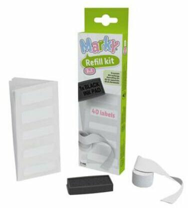 A készlet tartalma:-1 db fekete festékpárna kompatibilis az összes MARKY bélyegzővel-1 méteres vasalható szalag sötét textíliákhoz-40 db mosógépben mosható címke két különböző méretben