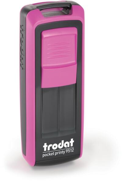Trodat Pocket Printy 9512 ECOBLACK-FUKSZIA zsebbélyegző (47x18 mm) lenyomattal együtt használatra készen. A Trodat Pocket Printy 9512 a legkedveltebb önfestékező zsebbélyegző fekete-fukszia színben. A zsebbélyegzőcsalád közepes méretű tagja maximum 5 sor szöveggel, fekete-fukszialila színű vázzal. Tökéletes megoldás azok számára, akik sokat utaznak, és a bélyegzőre is