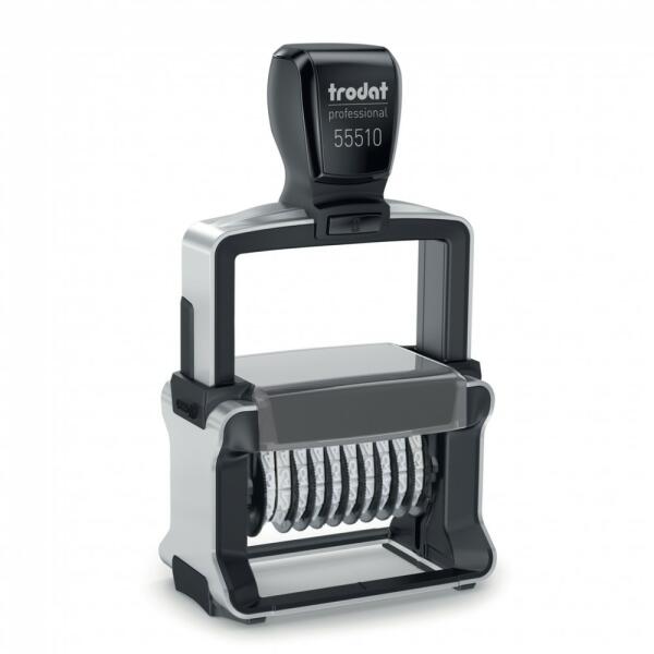 Trodat Professional 55510 fémházas, 10 számból álló önfestékező, sorszámozó bélyegző. A számok magassága 5 mm. Stabil 10 számjegyes számozóbélyegző, könnyed fogaskerekes állítással. A Professional ideális bélyegző a mindennapi irodai használatra. Tökéletesen kézbe fekszik az ergonomikusan kialakított fogantyúnak köszönhetően. Masszív acélváz szerkezete garant