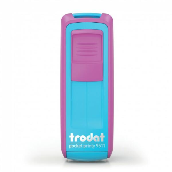 Trodat Pocket Printy 9511 TÜRKIZ-FUKSZIA zsebbélyegző (38x14 mm) lenyomattal együtt használatra készen. A Trodat Pocket Printy 9511 a legkedveltebb önfestékező zsebbélyegző türkiz-fukszialila színben. A zsebbélyegzőcsalád kisméretű tagja maximum 4 sor szöveggel, türkiz-fukszia színű vázzal. Tökéletes megoldás azok számára, akik sokat utaznak, és a bélyegzőre is gyakr