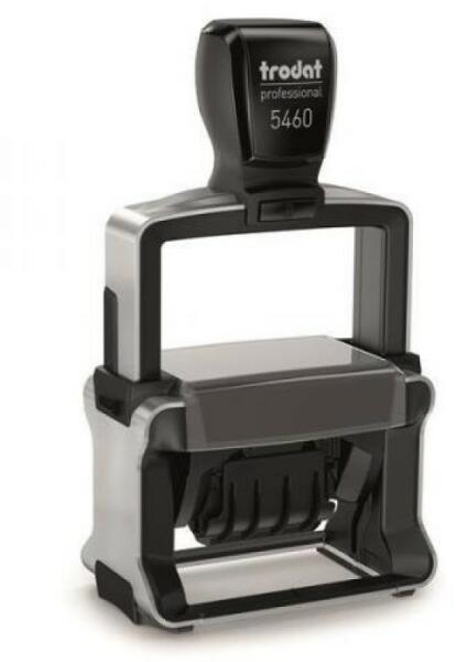 Trodat Professional 5460 fémházas dátumbélyegző ( 56 x 33 mm ) lenyomattal. Stabil 4-mm magas dátummal, könnyed fogaskerekes állítással. A legfőbb felhasználási területe a táblázatok, általában az úgynevezett iktatóbélyegzők raktárakban vagy például könyveléssel kapcsolatos feladatoknál. 56x33 mm-es lenyomattal. A zárt burkolatnak köszönhetően nem érintkezünk a ti