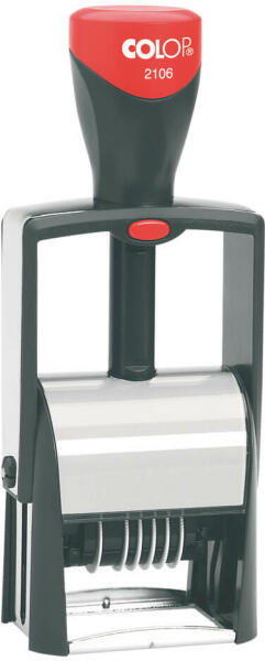 Fémvázas számbélyegző tartós használatra. 4 mm magas karakterekkel 6 számot bélyegez. Minden számszalag 0-9 számjegyeket, perjelet, kötőjelet, üres karaktert és pontot tartalmaz.