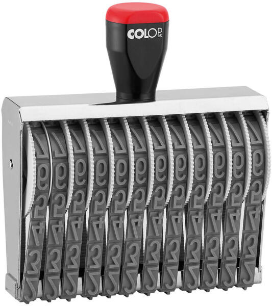 fémvázas számbélyegző tartós használatra 5 mm magas karakterekkel 10 számot bélyegez minden számszalag 0-9 számjegyeket, perjelet, kötőjelet, üres karaktert és pontot tartalmaz antibakteriális védelemmel ellátott cserepárnája: E/2600Gyártó/első EU forgalmazó elérhetősége: COLOP Stempelerzeugung Skopek GmbH&Co. KG 4600 Wels, Dr. -Arming-Straße 5, Ausztria colop@colop