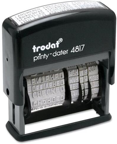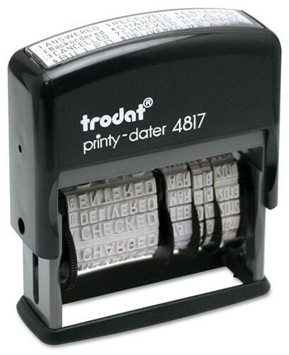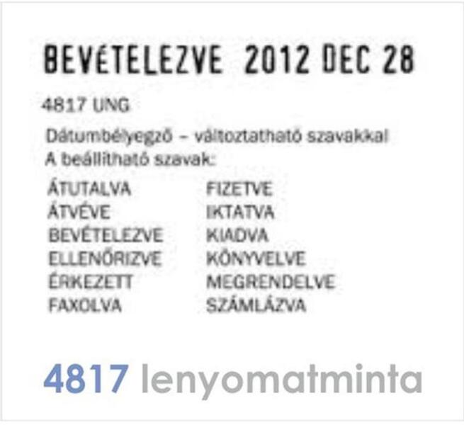 Trodat 4817 dátumbélyegző 12 féle állítható szöveggel Magyar dátumformátum Példa: " ÁTUTALVA 2016 MÁRC 16 " Egy bélyegzőn belül 12 szó, és még dátumbélyegző is. Dátummagasság: 4 mm. A bélyegzőn található szavak: ÁTUTALVA, ÁTVÉVE, BEVÉTELEZVE, ELLENŐRIZVE, ÉRKEZETT, FAXOLVA, FIZETVE, IKTATVA, KIADVA, KÖNYVELVE, MEGRENDELVE, SZÁMLÁZVA. A bélyegző csak UNG (hón
