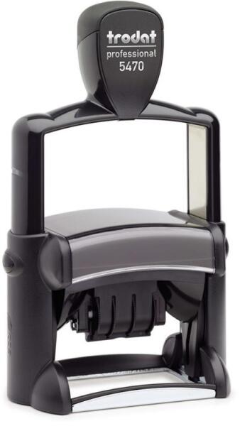 Trodat Professional 5470 fémházas dátumbélyegző ( 60 x 40 mm ) lenyomattal. Stabil 4-mm magas dátummal, könnyed fogaskerekes állítással. A legfőbb felhasználási területe a táblázatok, általában az úgynevezett iktatóbélyegzők raktárakban vagy például könyveléssel kapcsolatos feladatoknál. 60x40 mm-es lenyomattal. A zárt burkolatnak köszönhetően nem érintkezünk a ti