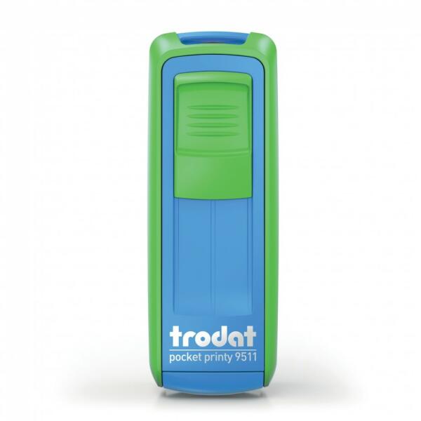 Trodat Pocket Printy 9511 ZÖLD-KÉK zsebbélyegző (38x14 mm) lenyomattal együtt használatra készen. A Trodat Pocket Printy 9511 a legkedveltebb önfestékező zsebbélyegző zöld-kék színben. A zsebbélyegzőcsalád kisméretű tagja maximum 4 sor szöveggel, zöld-kék színű vázzal. Tökéletes megoldás azok számára, akik sokat utaznak, és a bélyegzőre is gyakran szükségük van