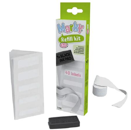 Utántöltő készlet Marky ruhajelölő bélyegzőhöz Praktikus utántöltő készlet arra az esetre, ha cserélni kell bélyegzőpárnát, vagy ha elfogy a címke és a vasalható szalag. A Marky utántöltő készlet tartalma:1 fekete festékpárna, amely minden MARKY bélyegzővel kompatibilis1 méter vasalható szalag a sötét ruhákhoz40 db mosogatógépben mosható címke két különböz