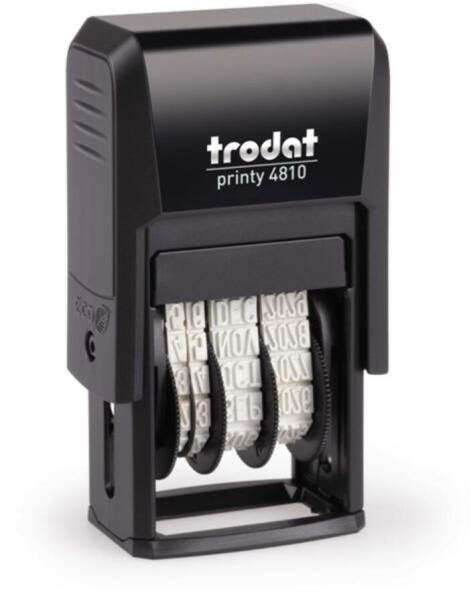 Leírás: Trodat 4810 MA dátumbélyegző -nap/hó/év -hónap számmal megjelenítve -önfestékező rendszer -az évszalag 12 évig használható -műanyag test -karaktermagasság: 3,8 mm -Forma szögletes -Ház színe fekete -Festék színe fekete Klímasemleges CO2=0 Nem hagy ökológiai lábnyomot. A gyártás során 100%-ban megújuló enegiaforrásokat használnak fel. A termékek méretén